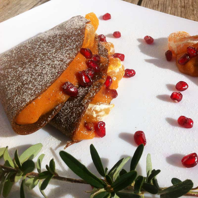 Spread the jam on the pancake, put a few pieces of a mandarin and fold it in quarters. Sprinkle with shredded coconut and pomegranate seeds.