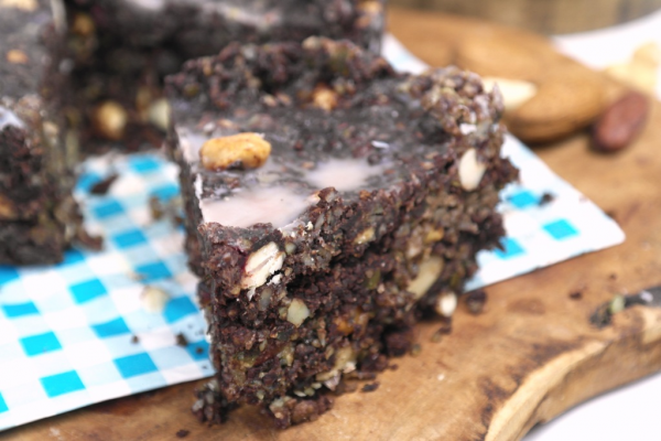 Vermaal de amandelen in de blender of met een vijzel totdat je amandelmeel overhoudt. Pureer in de keukenmachine alle ingrediënten behalve de gemengde ongebrande rauwe noten (bijvoorbeeld pecannoten, cashewnoten, pistache noten etc) en de kokosolie tot een fijne massa. Spatel de noten erdoor en tot slot de kokosolie. Stort de massa in de vorm en druk dit goed en stevig aan. Laat de taart in de koelkast hard worden.
